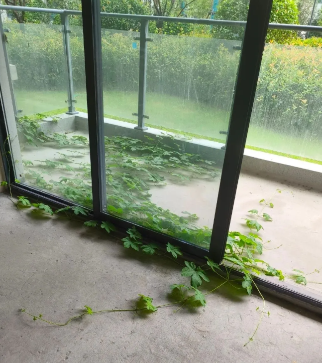 有些藤蔓还从另一侧“包抄”,已经越过了推拉门,从阳台登堂入室……
