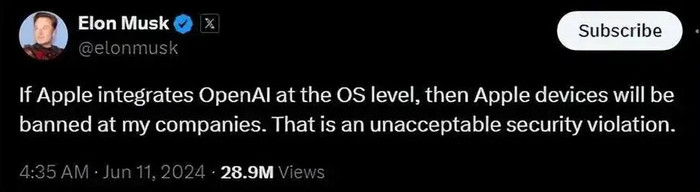 马斯克就曾直接指出:“若苹果在操作系统中整合OpenAI,公司将禁止使用苹果设备。这被视为不可接受的安全违规行为。”